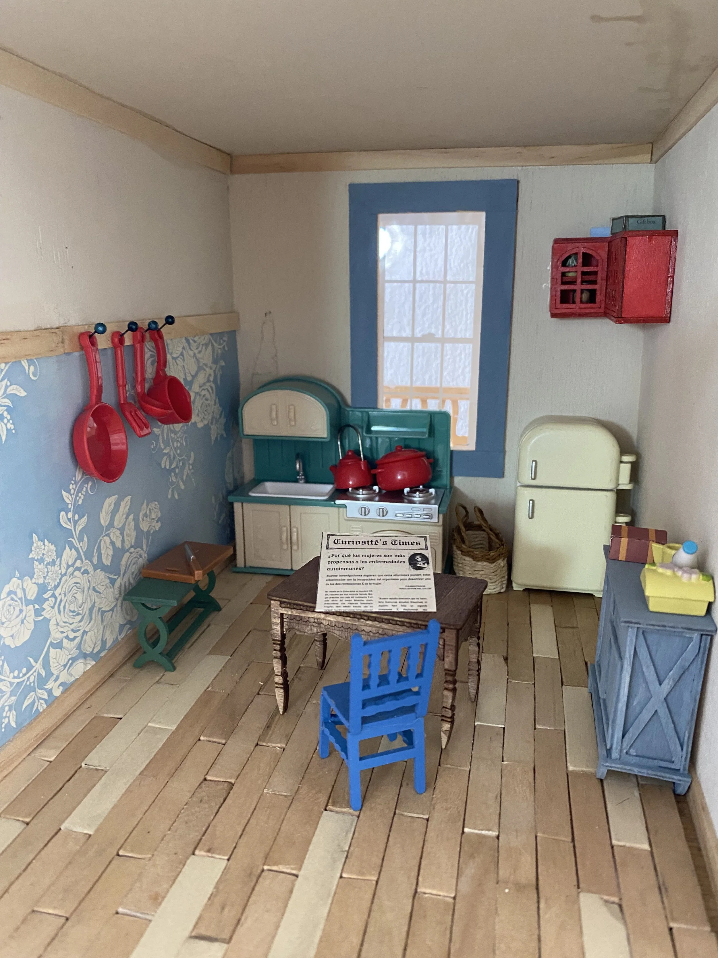 Casa de muñecas de madera, con intervención en técnica mixta tales cómo: bordado. escultura blanda, apropiación de objetos cómo juguetes a escala, dibujo a lápices de colores, pastel y acuarela.